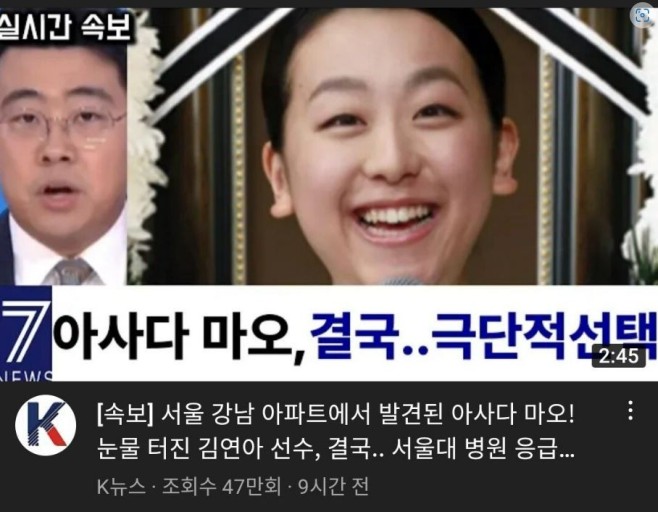 지난 17일에 한 유튜브의 채널에서 아사다 마오의 극단적 선택에 대한 속보가 올라왔다. 서울시 한 강남 아파트에서 발견되었으며 김연아 선수가 울다 지쳐 서울대 병원 응급실로 갔다는 속보 영상이었다. 총 2분 45초의 영상에서는 아사다 마오가 강남의 자택에서 극단적인 선택을 하였고 서울대 병원으로 실려 갔으나 숨을 거뒀다는 내용이었다.